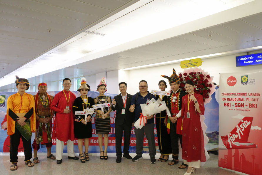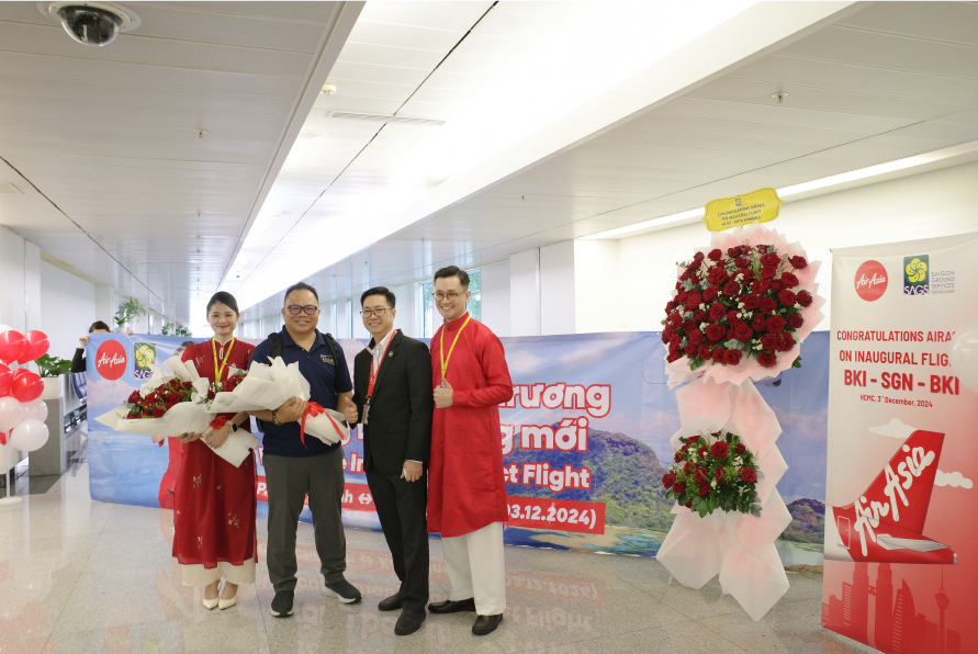 Ngày 03/12/2024, trong không khí rộn ràng đầy phấn khởi tại Cảng Hàng không Quốc tế Tân Sơn Nhất, CTCP Phục vụ mặt đất Sài Gòn (SAGS) đã hân hoan chúc mừng HHK AirAsia khai trương đường bay mới đến Thành phố Kota Kinabalu (BKI) – Malaysia với chặng bay thẳng BKI – SGN – BKI. Chuyến bay mang số hiệu AK1630/ 1631 khai thác bằng tàu bay Airbus A320, tần suất 03 chuyến/ tuần, hứa hẹn mang đến cho hành khách những trải nghiệm bay thú vị.