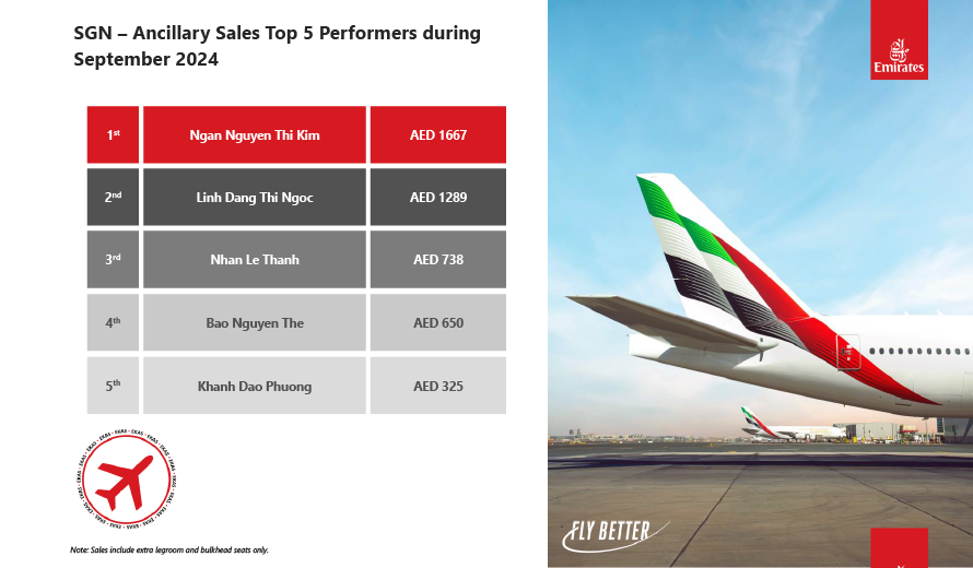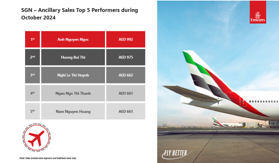 Ngày 05/12/2024, Hãng hàng không Emirates đã vinh danh nhân viên của Công ty Cổ phần Phục vụ Mặt đất Sài Gòn (SAGS) danh hiệu "2024 Ancillary Sales Incentives Top Performers" đối với chị Nguyễn Thị Kim Ngân và chị Nguyễn Ngọc Anh. Ngoài ra, cũng trong quý 4/2024, cụ thể là vào ngày 10/1/2025, anh Nguyễn Hoàng Nam và anh Lê Thành Nhân cũng đã được Hãng đánh giá những nỗ lực của mình thông qua danh hiệu "2024 Ancillary Sales Incentives Top Performers".