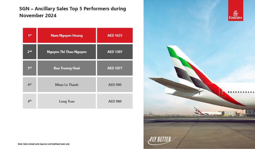 Hình 3: Anh Nguyễn Hoàng Nam đạt danh hiệu "2024 Ancillary Sales Incentives Top Performers" trong tháng 11 của HHK Emirates.