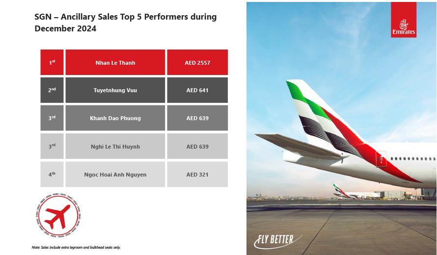 Hình 4: Anh Lê Thành Nhân đạt danh hiệu "2024 Ancillary Sales Incentives Top Performers" trong tháng 12 của HHK Emirates