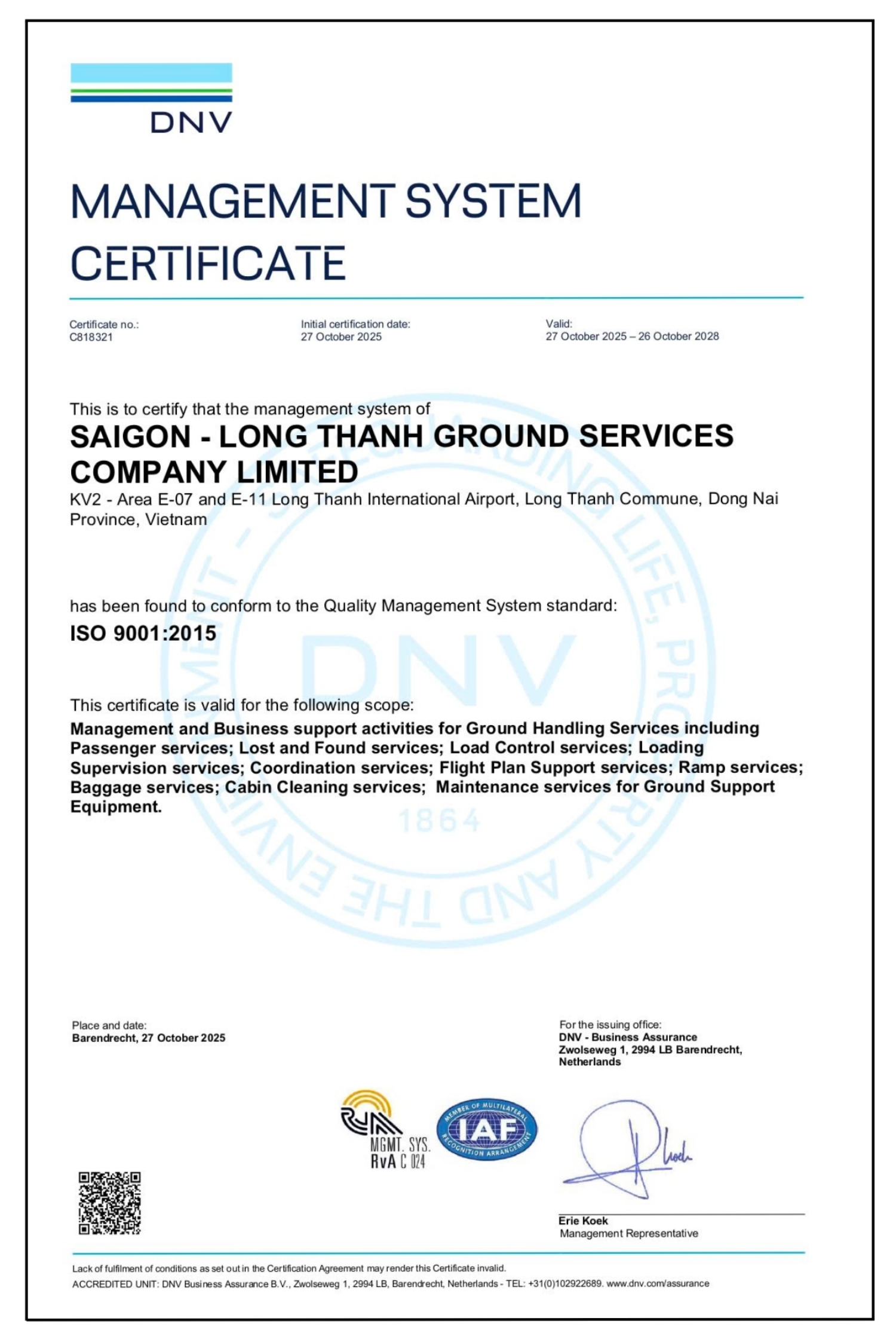 Chứng nhận được DNV Business Assurance B.V. (Hà Lan) phát hành, có hiệu lực từ ngày 27/10/2025 đến 26/10/2028. Đây là minh chứng cho việc SAGS – LTH đã xây dựng và vận hành hiệu quả hệ thống quản lý chất lượng phù hợp với các tiêu chuẩn quốc tế nghiêm ngặt, nhằm đảm bảo tính chuyên nghiệp, an toàn và hiệu quả trong mọi hoạt động phục vụ mặt đất tại Cảng Hàng không Quốc tế Long Thành.