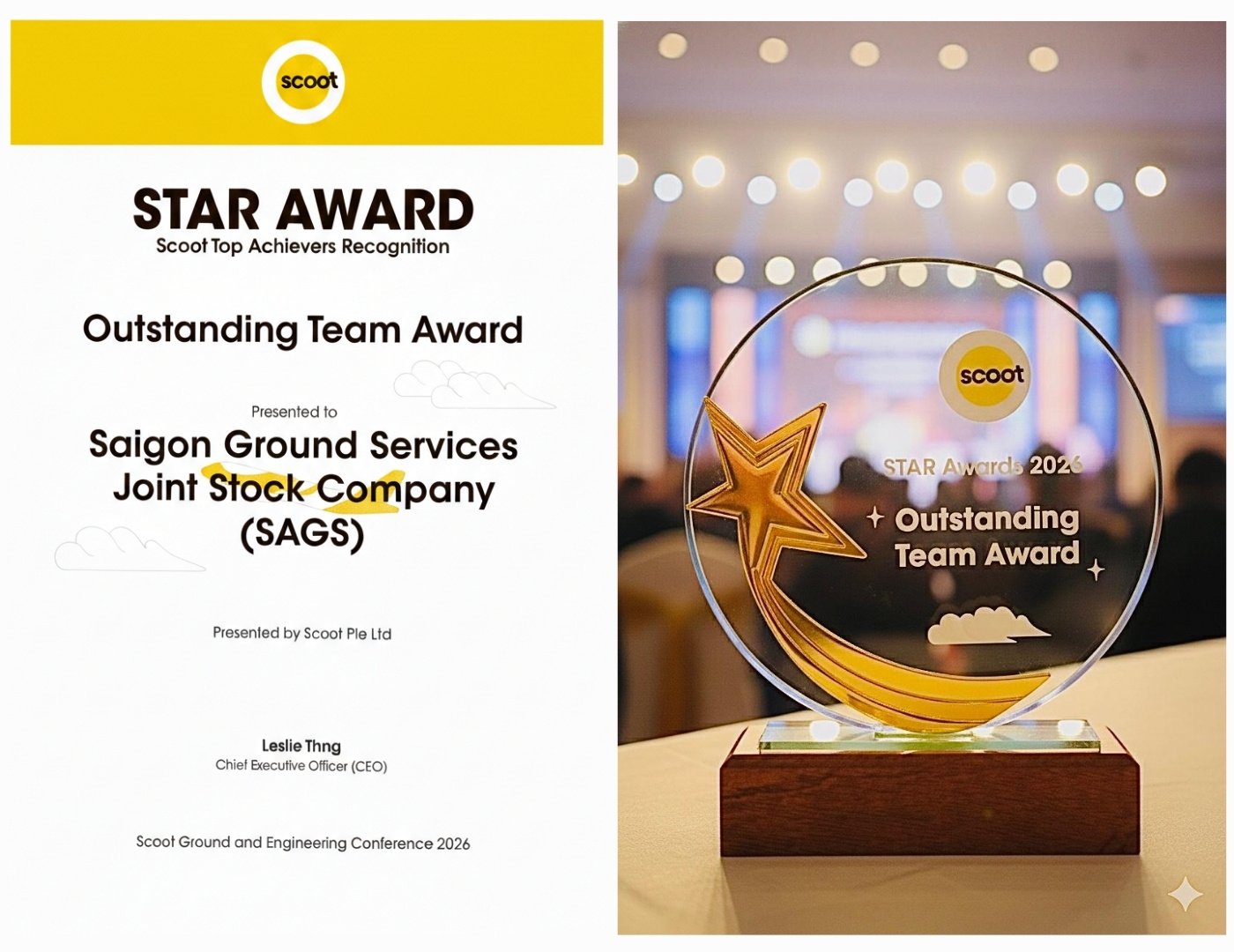 Ngày 20/01/2026, CTCP Phục vụ Mặt đất Sài Gòn (SAGS) được Scoot trao tặng giải thưởng Outstanding Team Award tại chương trình STAR Award 2026, trong khuôn khổ hội nghị Scoot Ground and Engineering Ops Conference 2026 diễn ra tại Singapore. Đây là sự kiện được tổ chức định kỳ hai năm một lần nhằm ghi nhận các đơn vị có thành tích vận hành nổi bật trong toàn mạng lưới khai thác của hãng.