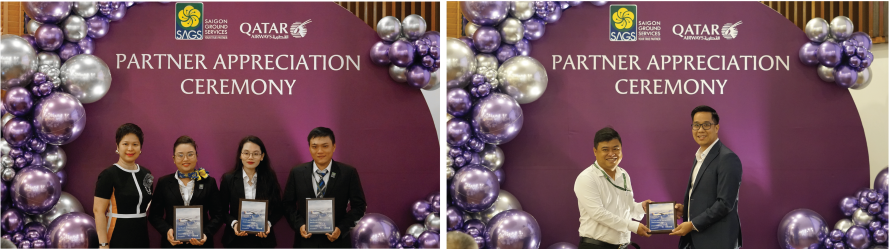 Giám đốc vùng và Trưởng đại diện của HHK Qatar Airways tại Cảng HKQT Tân Sơn Nhất trao tặng danh hiệu "ĐƠN VỊ PHỤC VỤ MẶT ĐẤT HÀNG ĐẦU KHU VỰC CHÂU Á THÁI BÌNH DƯƠNG" cho đại diện Ban Lãnh đạo SAGS