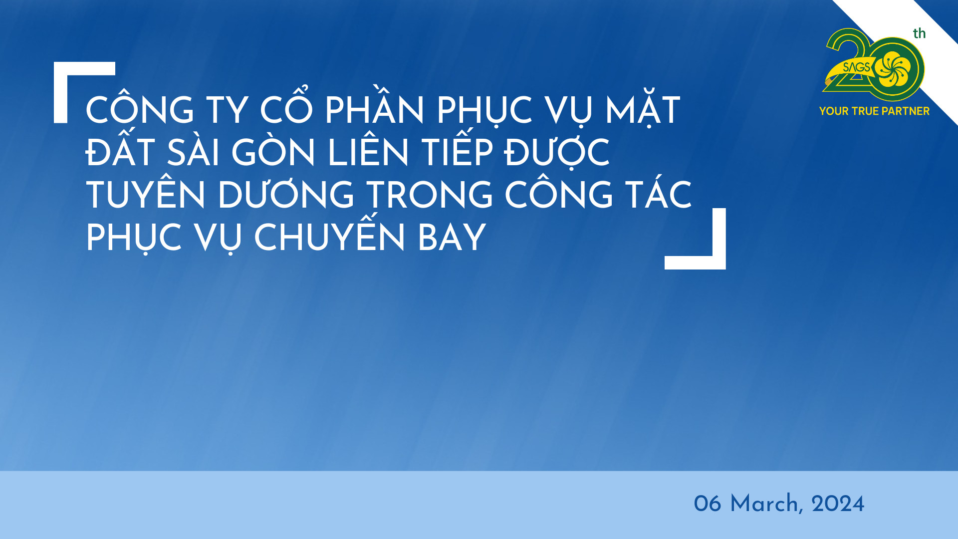 Ngày 13/05/2024, Công ty cổ phần Phục vụ mặt đất Sài Gòn (SAGS) vinh dự được hãng hàng không 05 sao Qatar Airways trao tặng danh hiệu "ĐƠN VỊ PHỤC VỤ MẶT ĐẤT HÀNG ĐẦU KHU VỰC CHÂU Á THÁI BÌNH DƯƠNG". ...