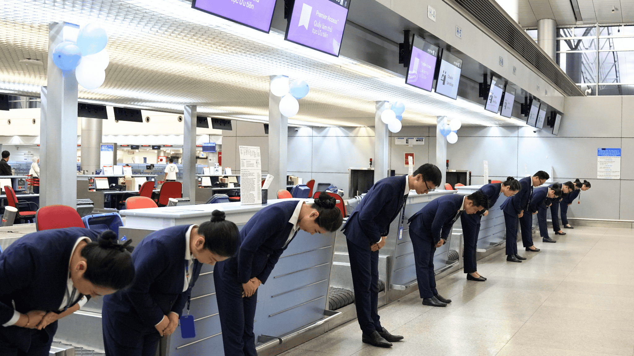 Nhân viên SAGS thực hiện nghi thức chào đón hành khách trước giờ mở quầy thủ tục. Ảnh: SAGS