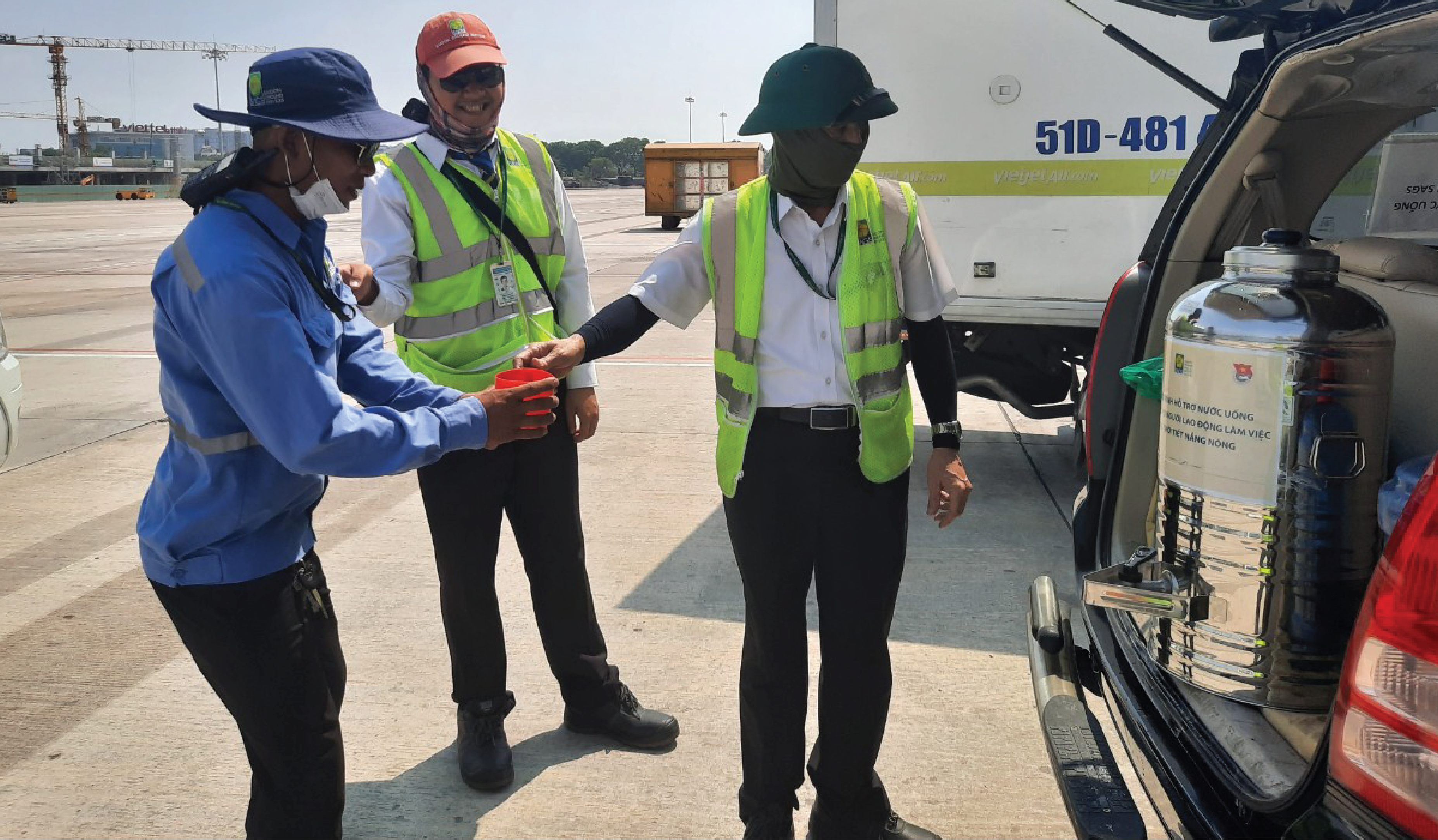 Theo Trung tâm Dự báo Khí tượng Thủy văn Quốc Gia, TP. Hồ Chí Minh đang trải qua đợt nắng nóng gay gắt nhất trong năm vào những ngày trong Tháng 4-5. Đặc biệt tại Cảng HKQT Tân Sơn Nhất, toàn bộ khu vực sân đỗ tàu bay, đường lăn, đường tiêp cận với nền bê tông hấp thụ nhiệt trên diện rộng khiến nhiệt độ có thời điểm lên tới 60 độ C, cùng với sức nóng tỏa ra từ những con chim sắt khổng lồ và các phương tiện phục vụ mặt đất. Dưới điều kiện thời tiết khắc nghiệt, CBNV công tác tại sân đỗ là những mắt xích thầm lặng nhưng không thể thiếu trong cả dây chuyền phục vụ không những càng phải nỗ lực hơn bình thường để đảm bảo tuyệt đối an toàn cho mọi hoạt động bay, mà còn phải giữ vững tinh thần cũng như sức khỏe trong quá trình công tác.